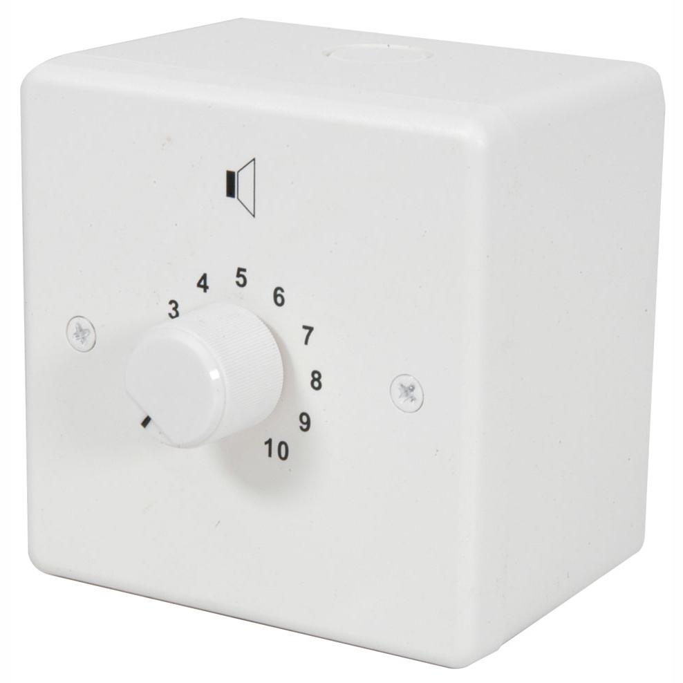 CAS ATT50R is a 50 watt, 100 volt line wall mounted volume control attenuator with a 24V relay to enable bypass to full volume when triggered from a fire alarm panel.