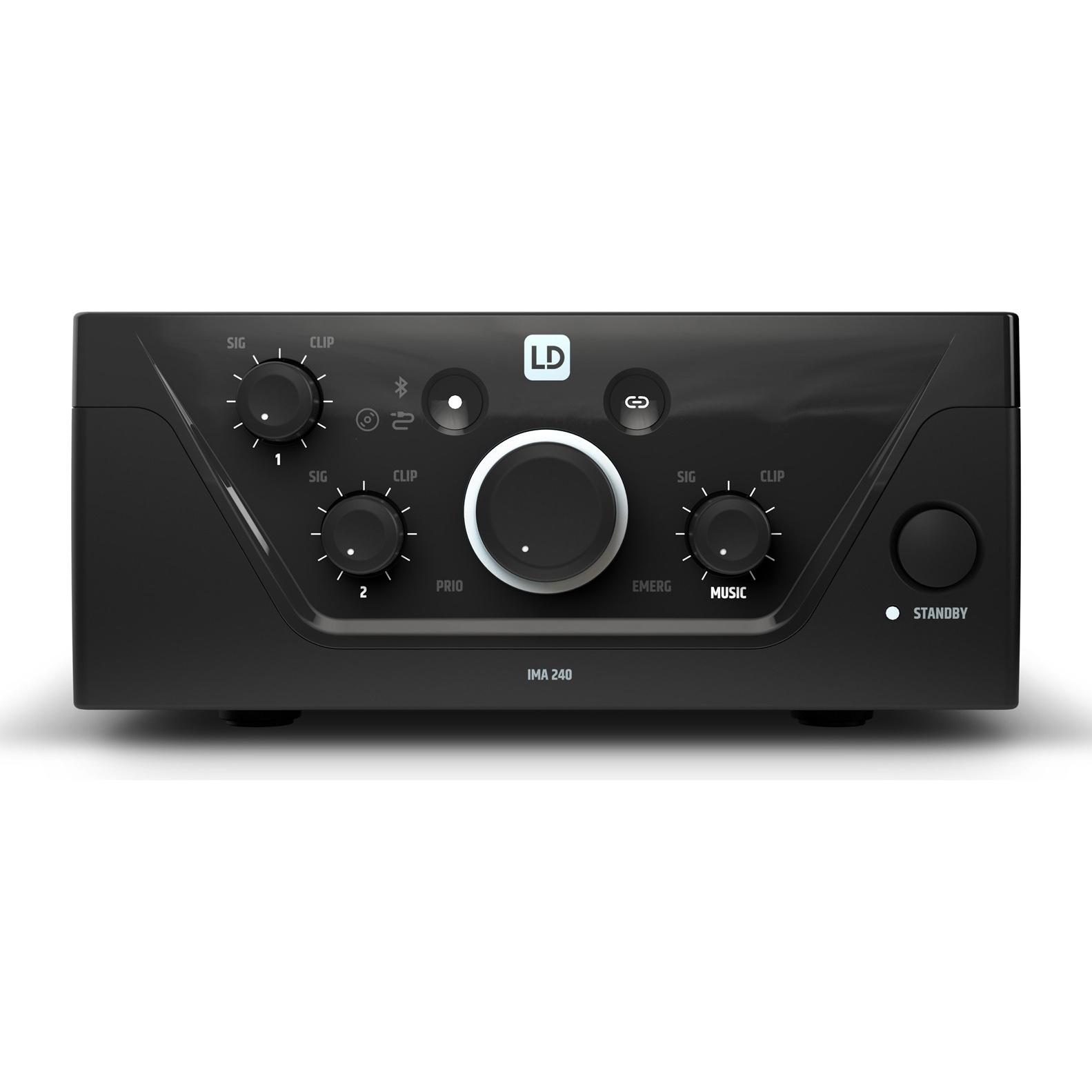 The LDIMA240 offers 2 mic/line inputs with individual gain controls. The third gain control on the front of the amp is for the 2 music source inputs and Bluetooth module each of which is selected in turn via a single touch sensitive button. A further touch sensitive button activates Bluetooth pairing.