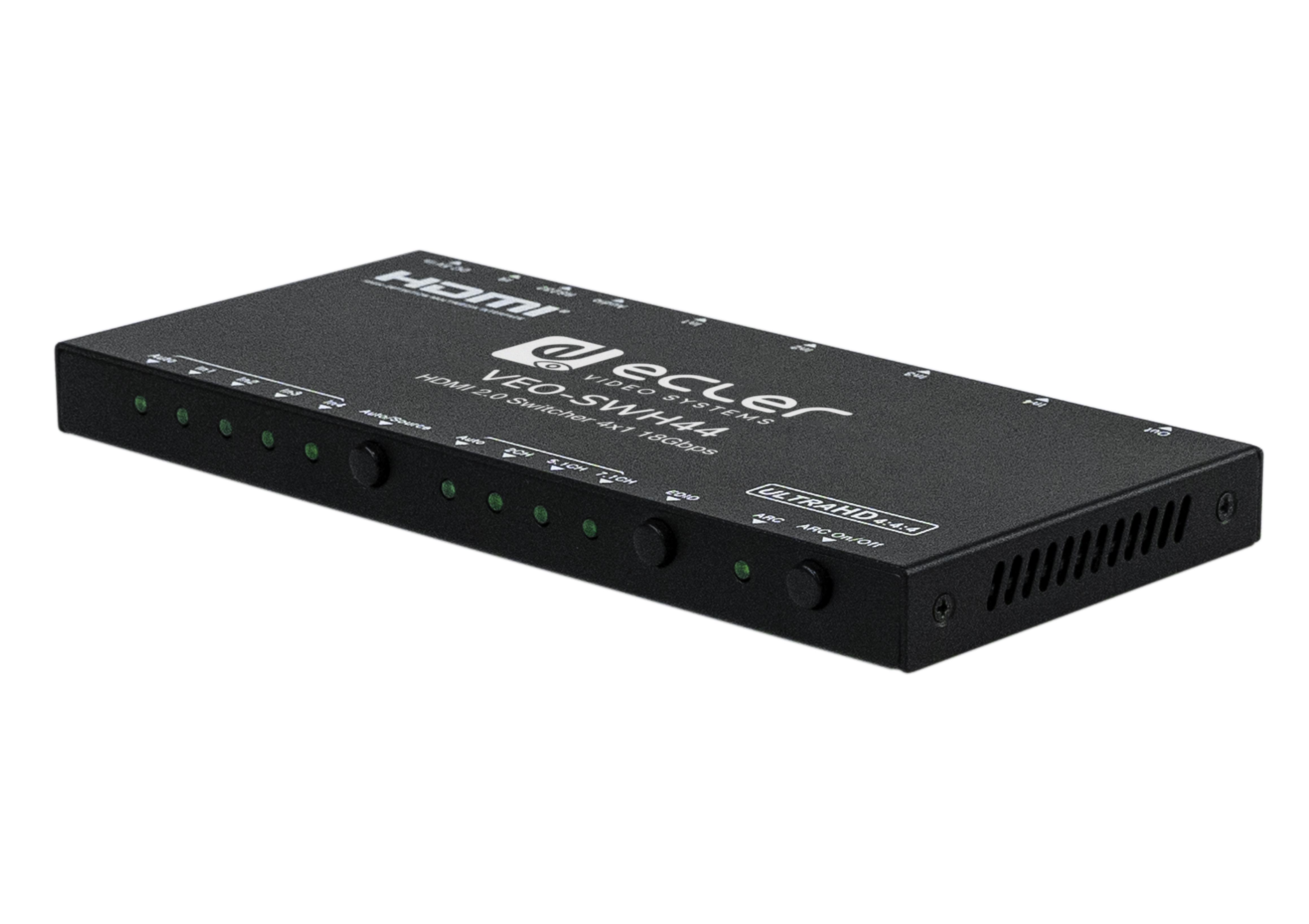 The Ecler VEO-SWH44 is a 4x1 HDMI switcher for high dynamic range (HDR) formats. It's the ideal solution for applications requiring 4K/UHD and HDR sources and displays.