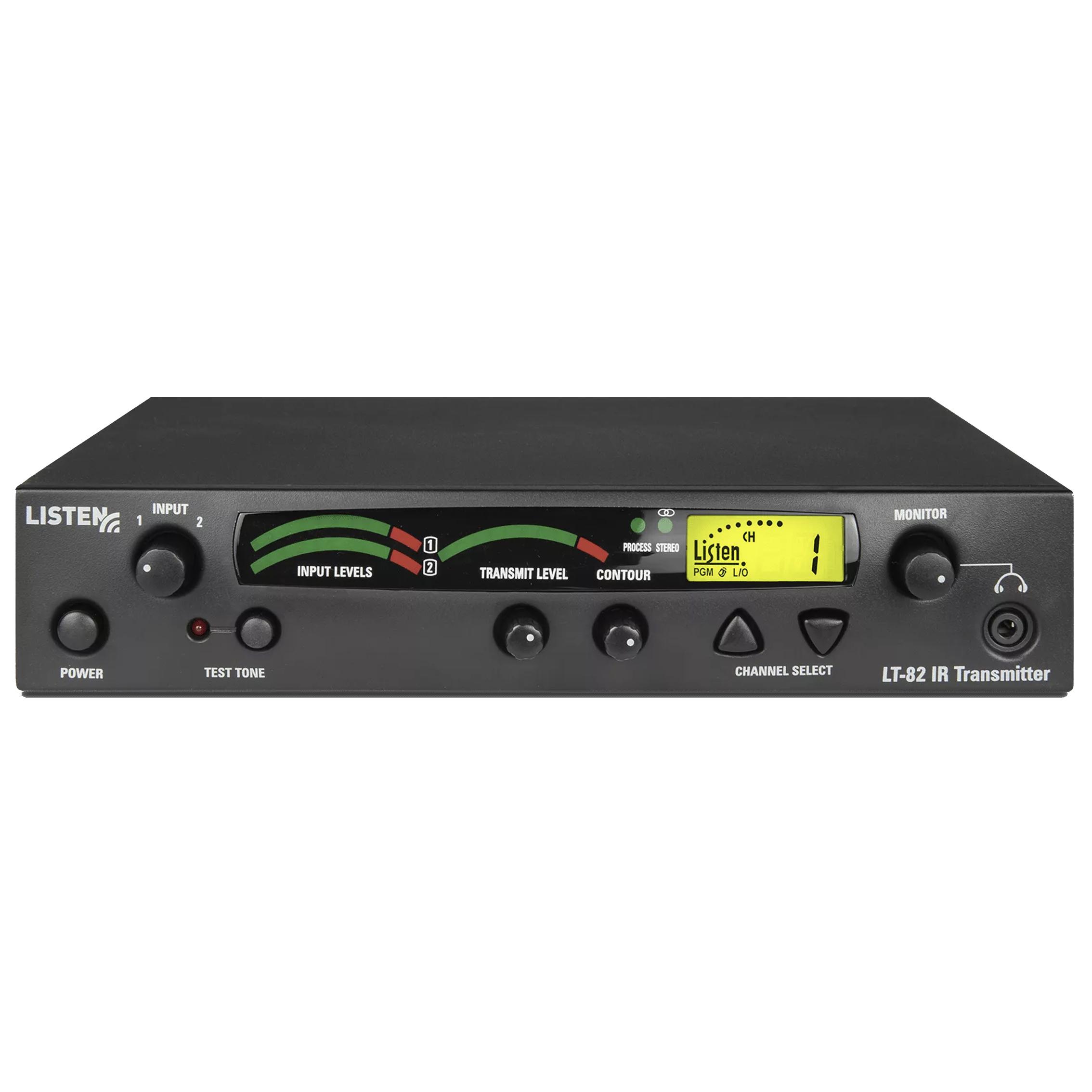 The Listen Technologies LT-82-02 transmitter is the heart of a stationary Infra Red hearing system. Capable of operating in either mono or stereo modes, the LT-82 transmits your audio signal to and provides DC power for one or more LA-140 infrared radiator/emitter units through a standard CAT-5 cable.