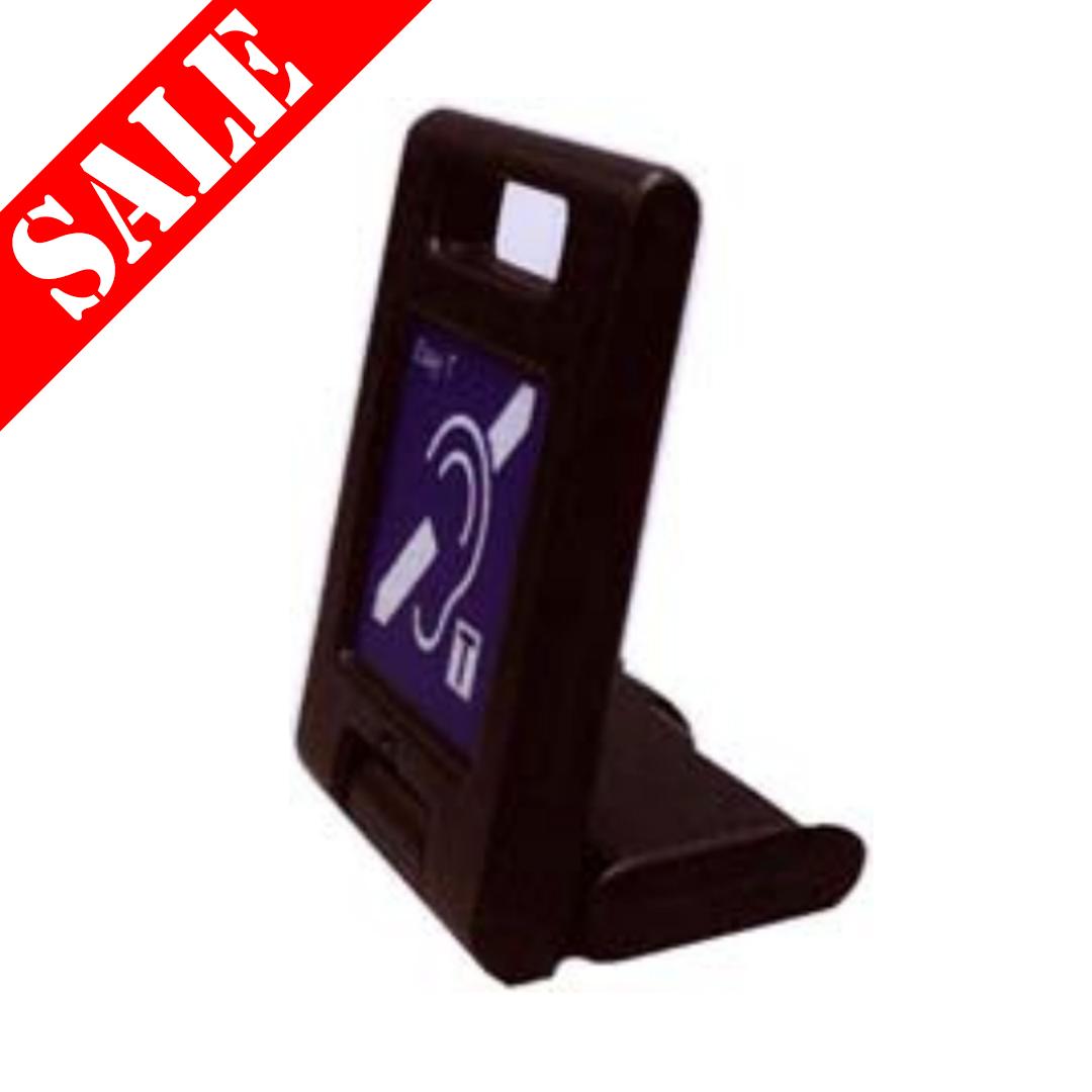 The hinged base enables the PET to stand upright in a near vertical position on a table or counter or it can be laid flat for completely unobtrusive assistive hearing in a meeting or teaching environment.