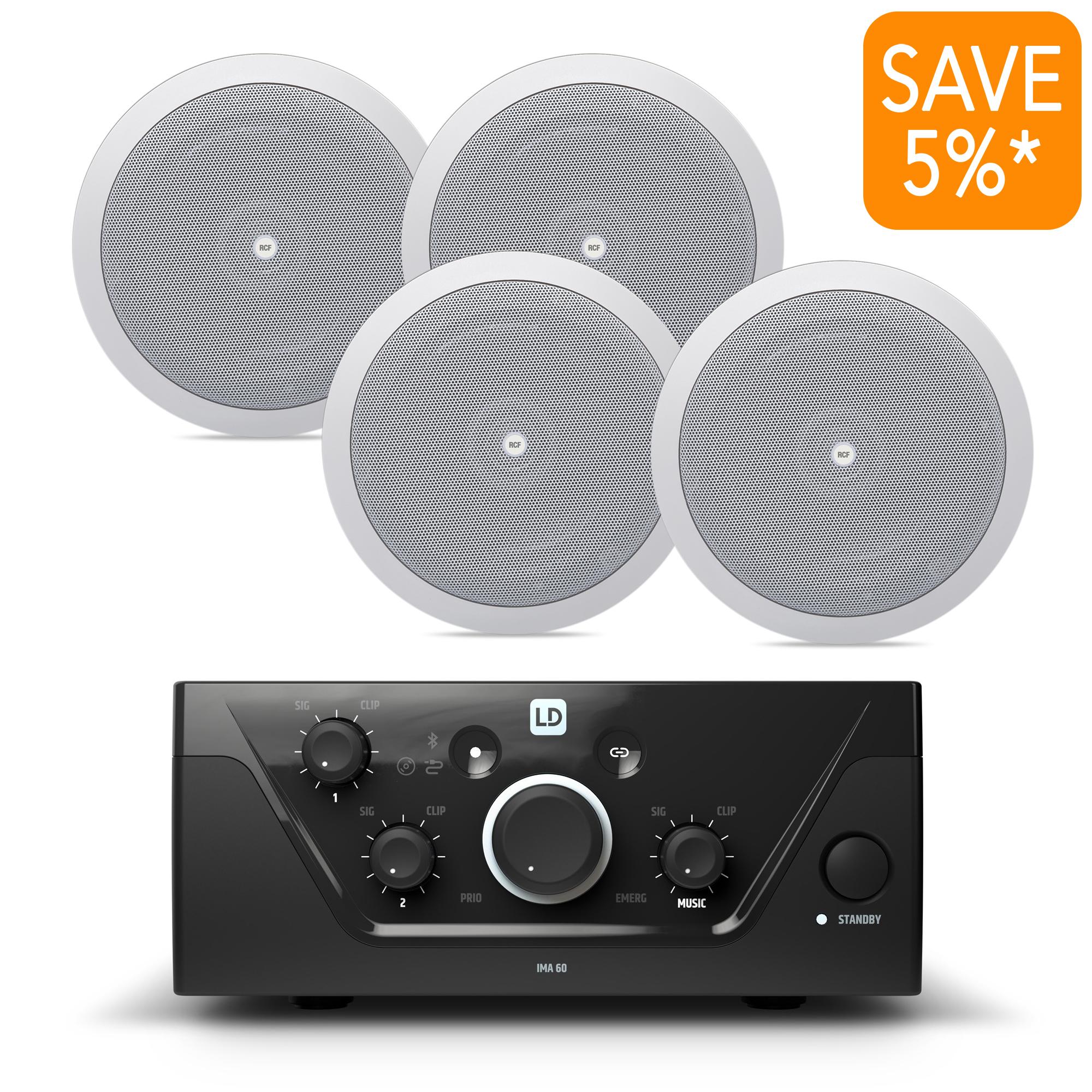 The package includes the LD Systems IMA60 amplifer & four RCF PL6X ceiling speakers tapped at 12 watts.