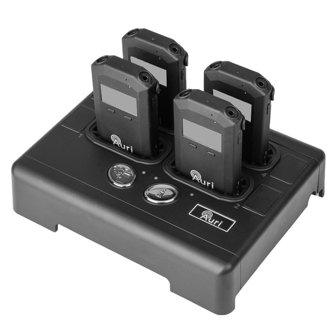 The Listen Technologies Auri-D4 charging & docking station not only provides a charging facility for up to four RX1 Auracast receivers, but also offers network capability and can store receiver configurations, enabling centralized management, programming, and configuration of the docking station and the receivers via Auri Manager software.