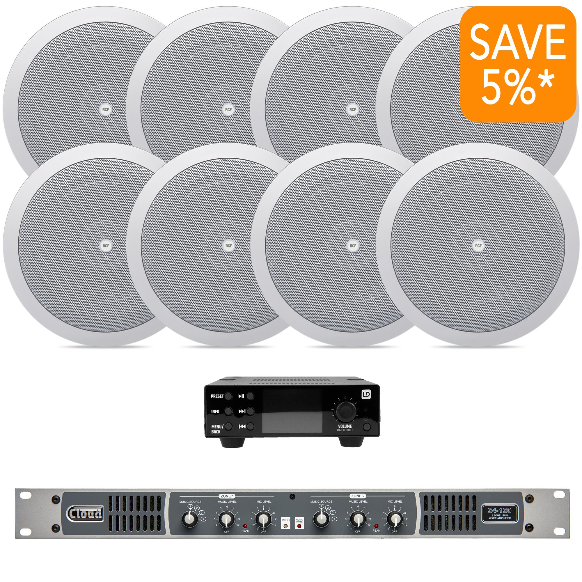 The package includes the Cloud Electronics 24-120 two zone mixer amplifer, the versatile LD Systems RSMP music streamer & eight RCF PL6X ceiling loudspeakers in white, each tapped at 12 watts.