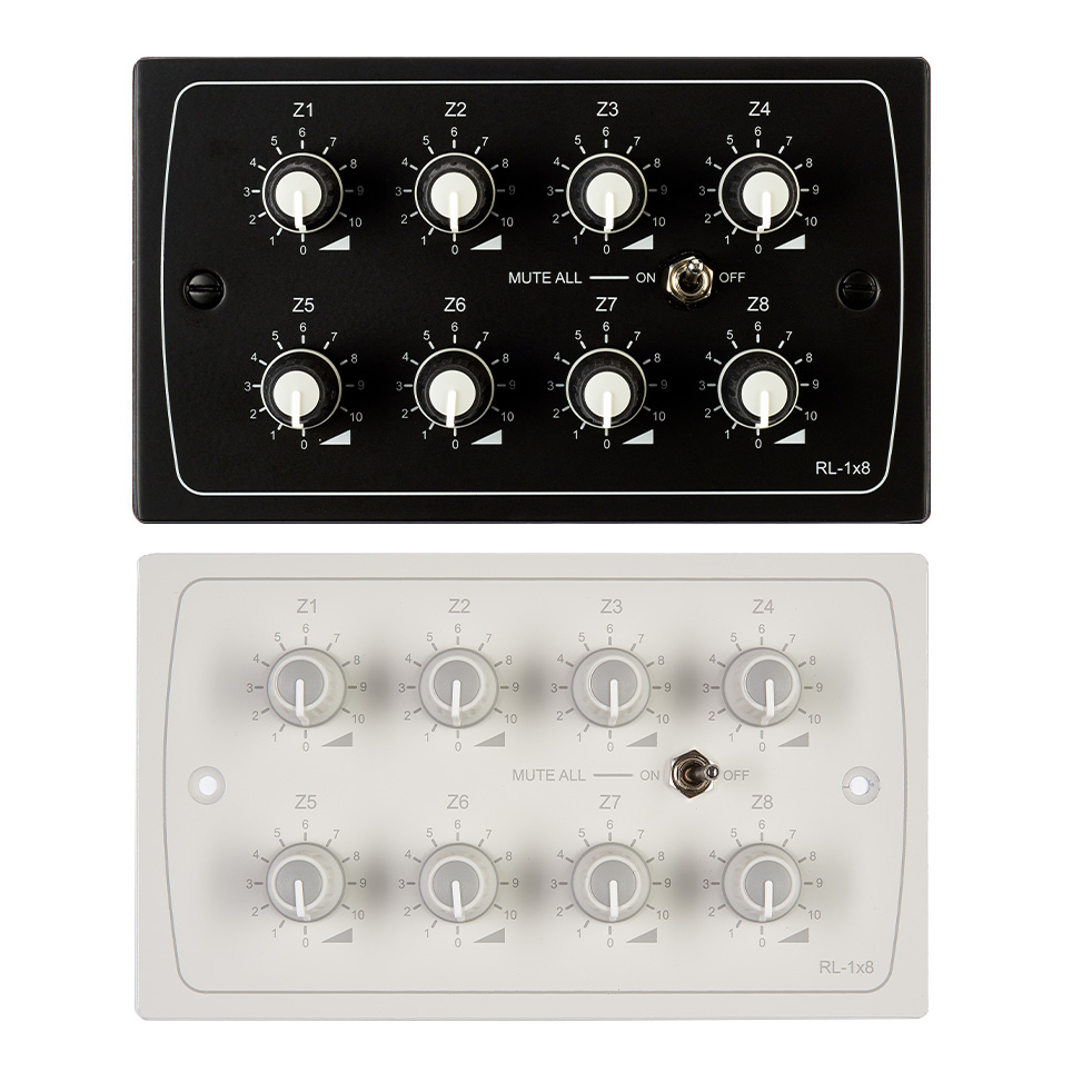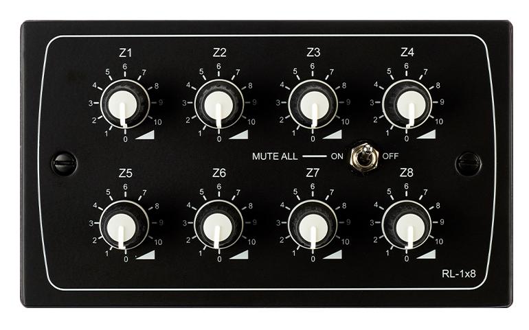 The Cloud Electronics RL-1X8B is a multizone remote volume level controller. Each of the eight zones have individual volume control and there’s also a ‘MUTE ALL’ switch.