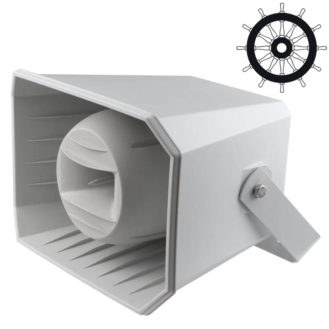 Water resistant, rated IP55; suitable for both indoor and outdoor maritime applications. This rugged MH30T-MED music horn is constructed from light grey ABS & polypropylene, exterior screws are stainless steel and the mounting bracket is made from aluminium.