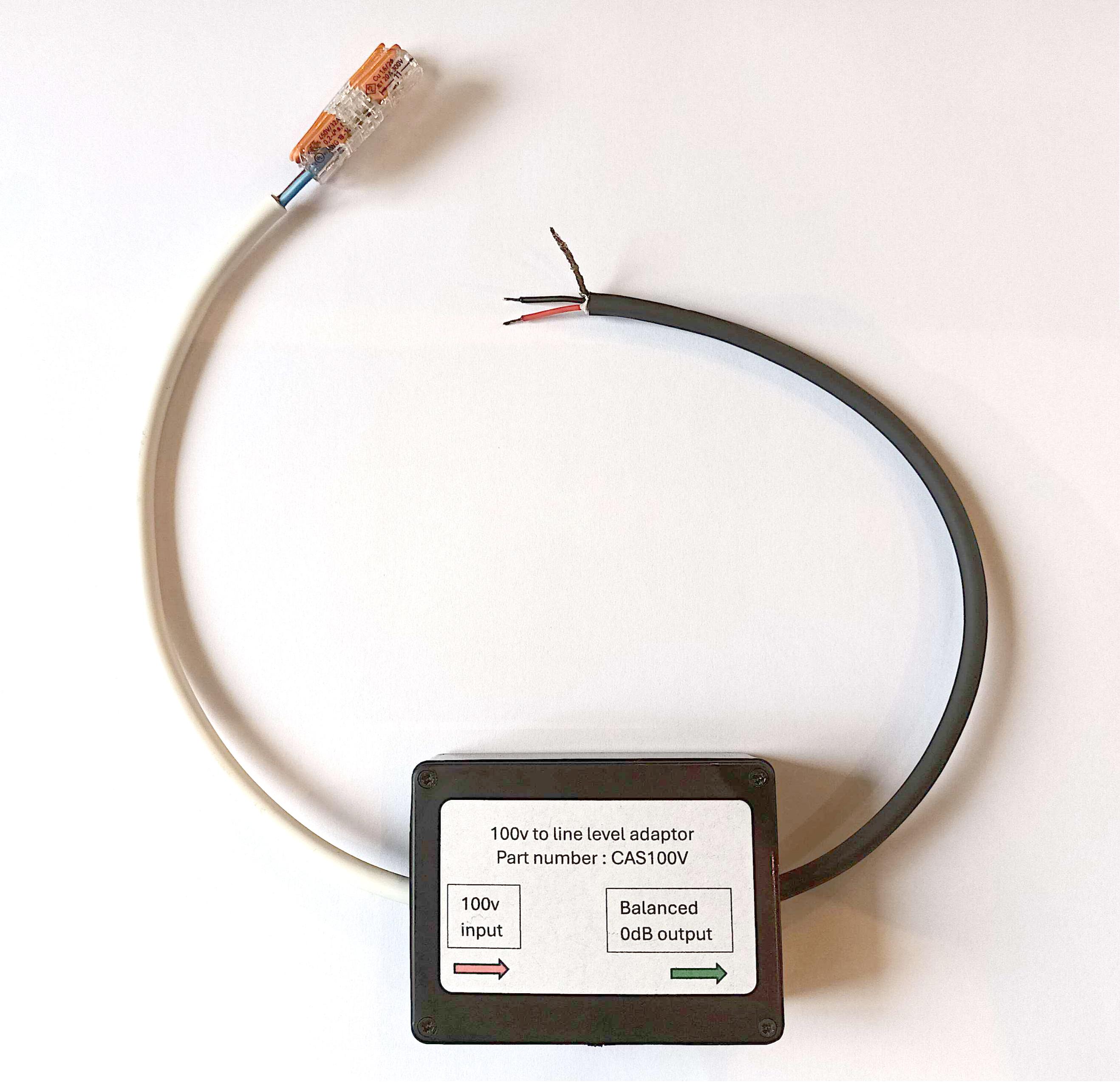 The CAS100V is a 100V line to line level adaptor, transformer isolated.