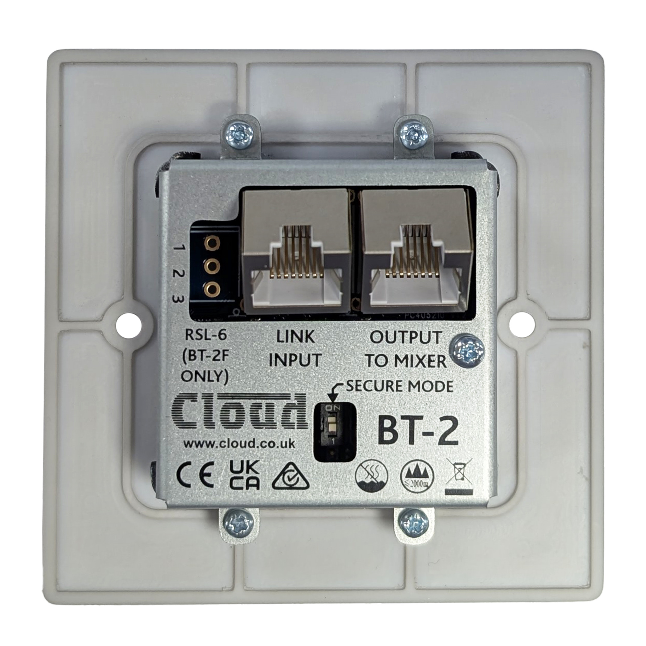 The Cloud Electronics BT-2EB remote Bluetooth wall-mounting input module is for use with the Cloud DCM1 and DCM1e which are equipped with an RJ45 Extension Port.