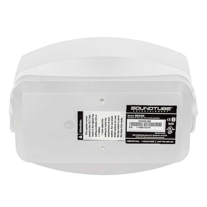 Soundtube SM400i-WH mkII, white, 4″ coaxial wide dispersion surface mount loudspeaker designed for both low impedance (4 ohm) and high impedance (100 volt line or 70.7 volt line) public address sound systems. Rated at 20 watts, 100 volt line or 4 ohms, low impedance.