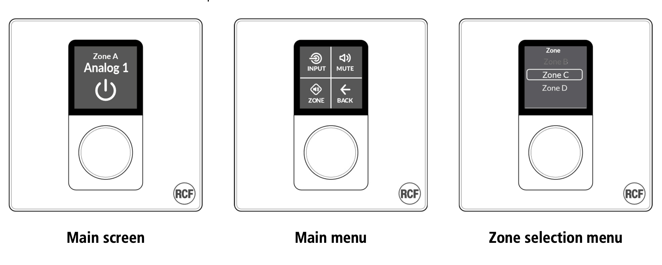 The RCF RC KPS B is a wall-mounted remote control unit for use with RCF KPS series amplifiers and enables adjustment of zone volumes and source selection.
