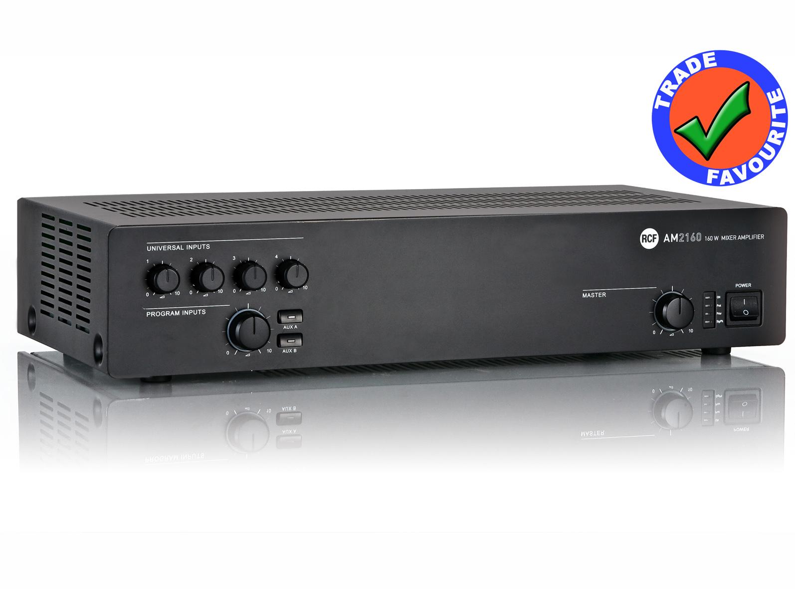The RCF AM 2160, one of our favourite products, is a 160 watt mixer amplifier with 4 mic / line inputs - an ideal public address amplifier for both background music and paging.