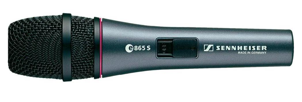 The Sennheiser e 865s electret condenser hand held vocal microphone with noiseless on/off switch has a super-cardioid pickup pattern and is designed for live performance vocals with a natural detailed sound.