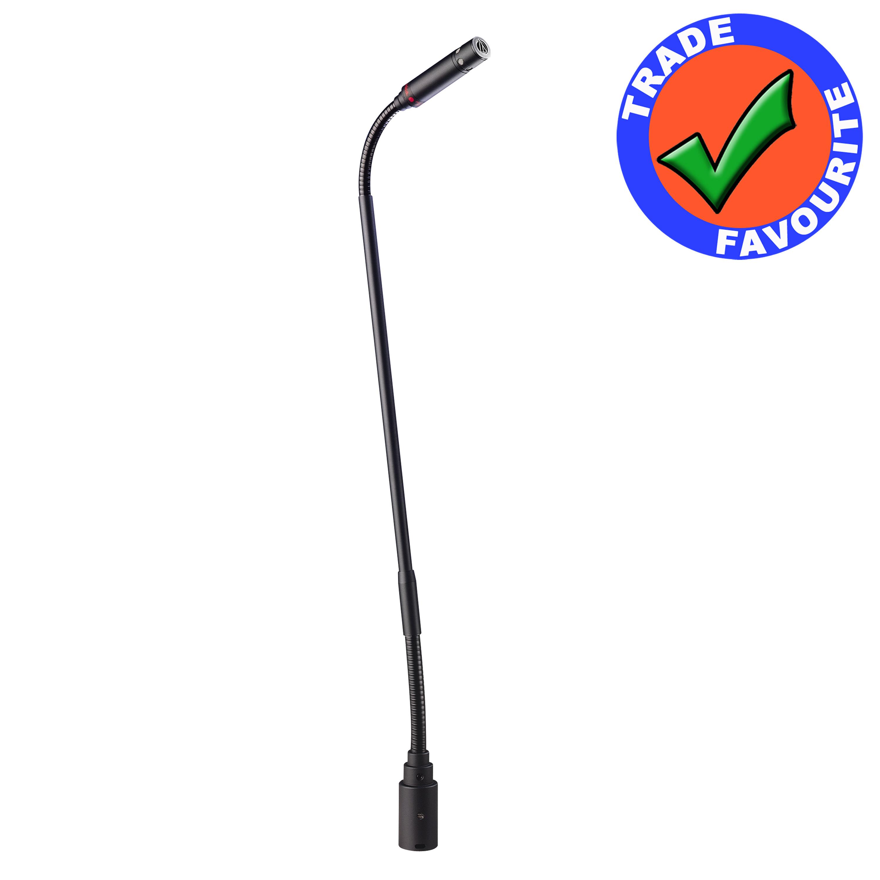 The Audio Technica PRO 49QL is one of our favourite products. This longer length quick-mount double-gooseneck cardioid condenser microphone is designed to plug into any standard XLRF-type surface or cable connector.