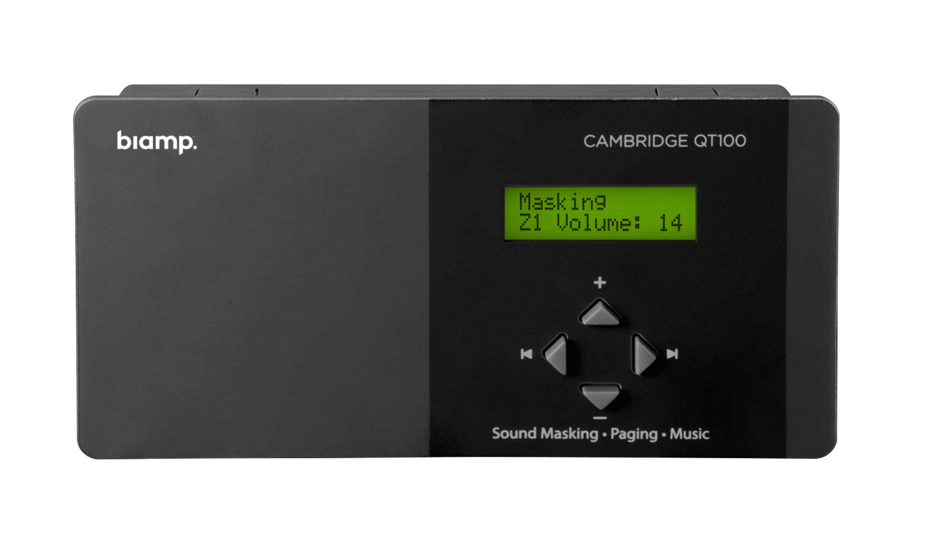 The Cambridge Sound Management Qt 100 sound masking controller is suitable for areas of up to 12,000 square feet (1,115 m²) over a single zone with up to 120 emitters.