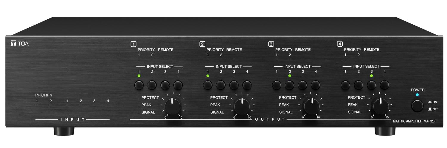The TOA MA-725F matrix mixer amplifier is a combined 6×4 audio matrix, DSP and 4ch Class-D amplifier. There are four output channels each rated at 250 watts, 70 / 100 volt line.