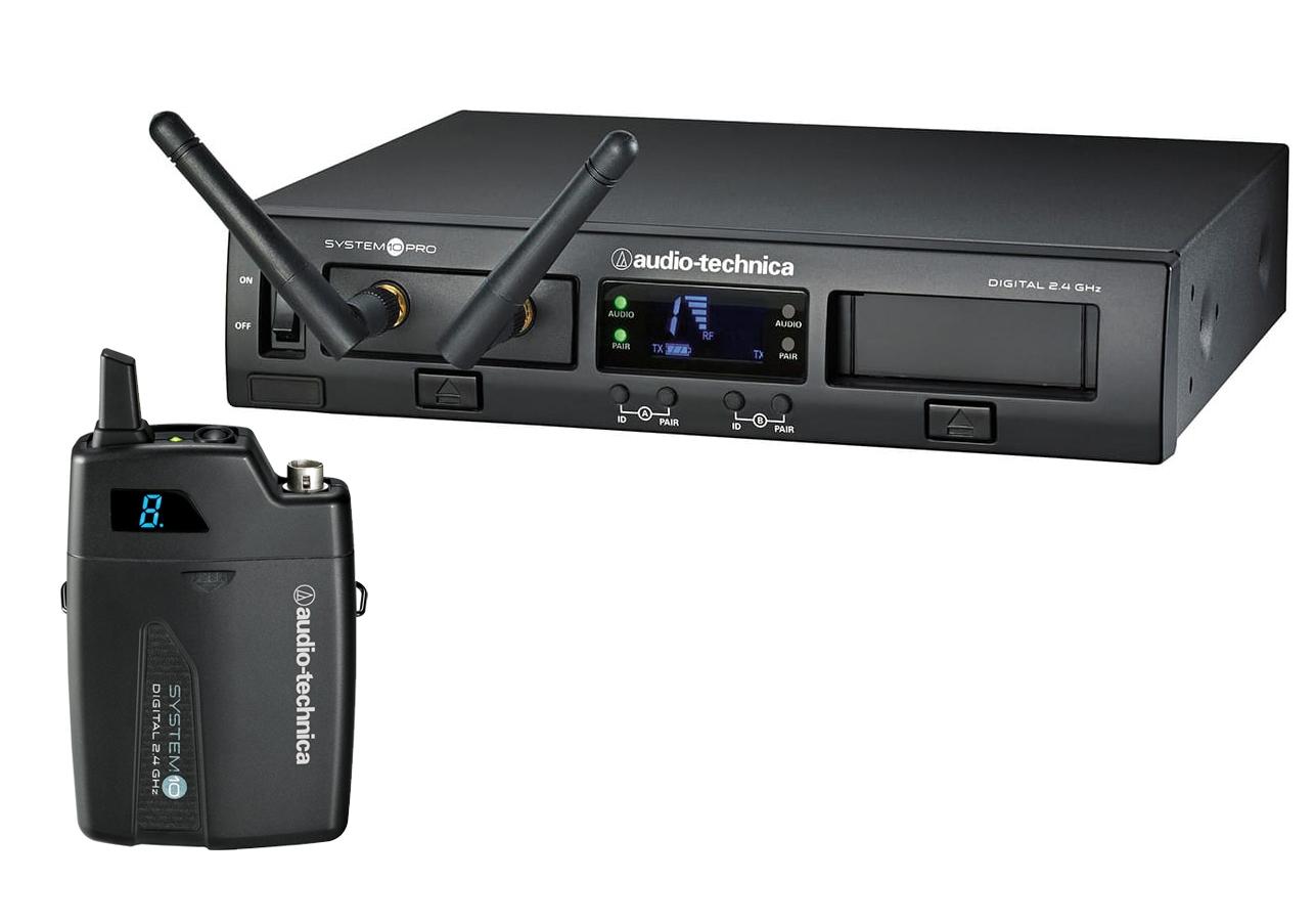 The Audio Technica System 10 PRO ATW-1301 wireless radio microphone system includes a rack mountable dual receiver chassis fitted with one receiver and a beltpack transmitter. Operating on 2.4GHz, free from interference from TV frequencies.