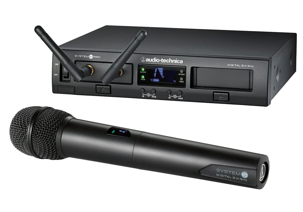 The Audio Technica System 10 PRO ATW-1302 wireless radio microphone system includes a rack mountable dual receiver chassis fitted with one receiver and a handheld dynamic unidirectional transmitter. Operating on 2.4GHz, free from interference from TV frequencies.
