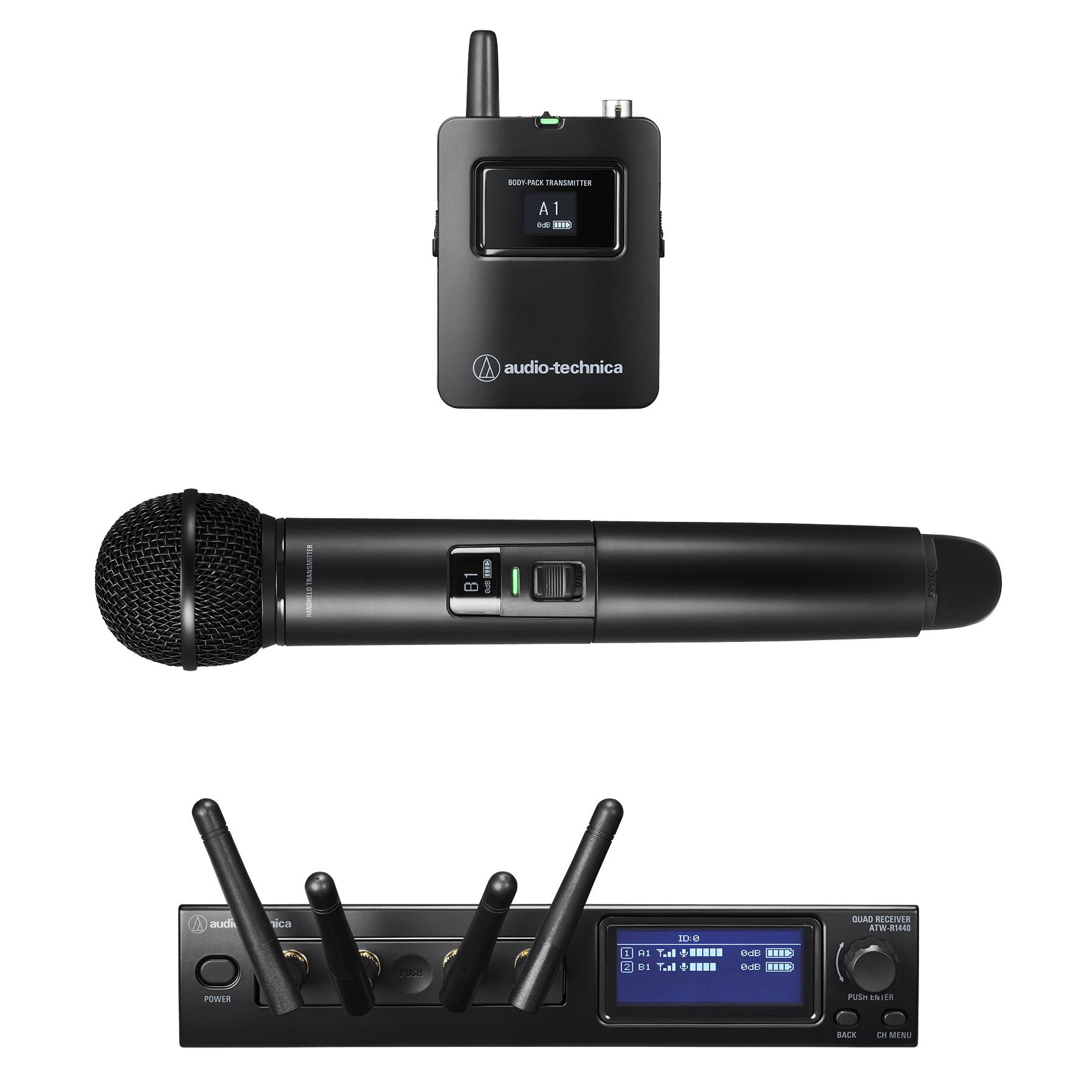 The system includes one Audio Technica ATW-R1440 wireless microphone quad receiver, one Audio Technica ATW-T1401 bodypack transmitter* and one Audio Technica ATW-T1402 handheld microphone transmitter.