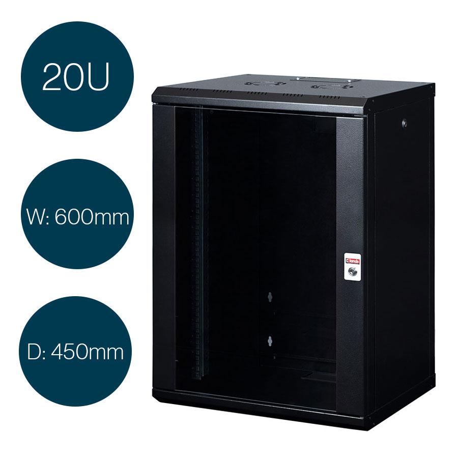 The Lande PROLINE Series PR20U6045-BL 20U floor and wall mounting 19" equipment rack (450mm deep) is finished in black, but is also available in light grey.
