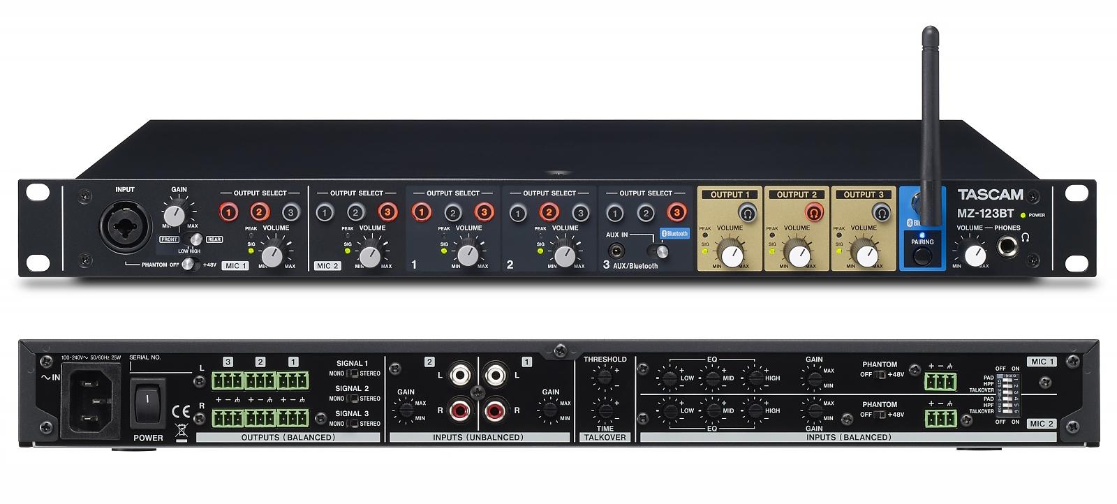 Tascam MZ-123BT compact 1U multi-channel, three zone audio mixer for professional installation.