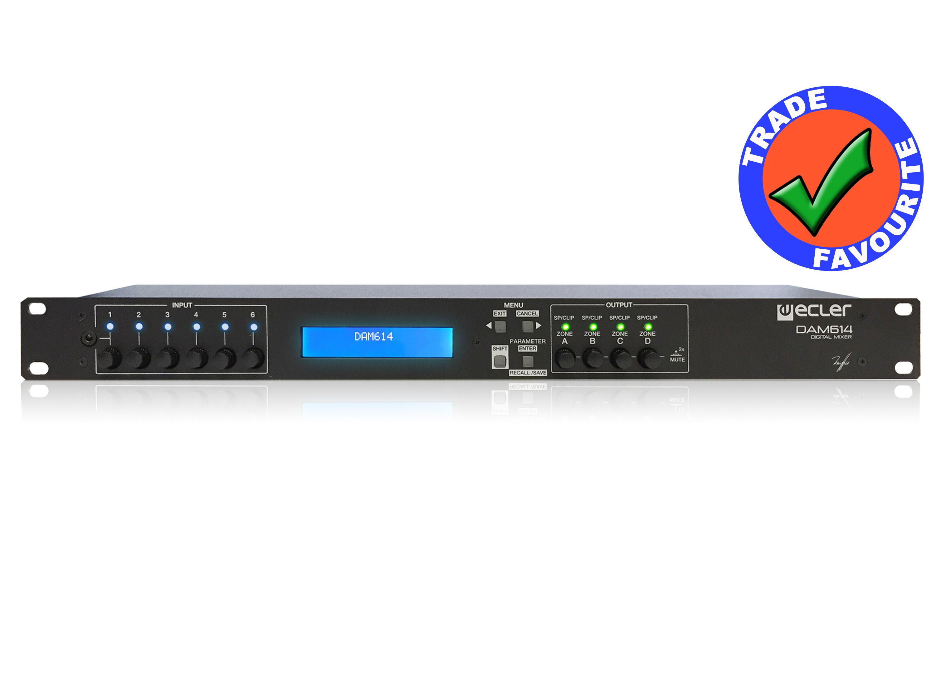 The ECLER DAM614 fully programmable audio digital mixer is one of our favourite products. It features 6 audio inputs and 4 audio outputs, front panel inputs and outputs level controls, DSP processing, RS-232 connectivity and 4 remote control ports (0-10VDC). Its 4 outputs can be used as mono independent zones or coupled as stereo zones.