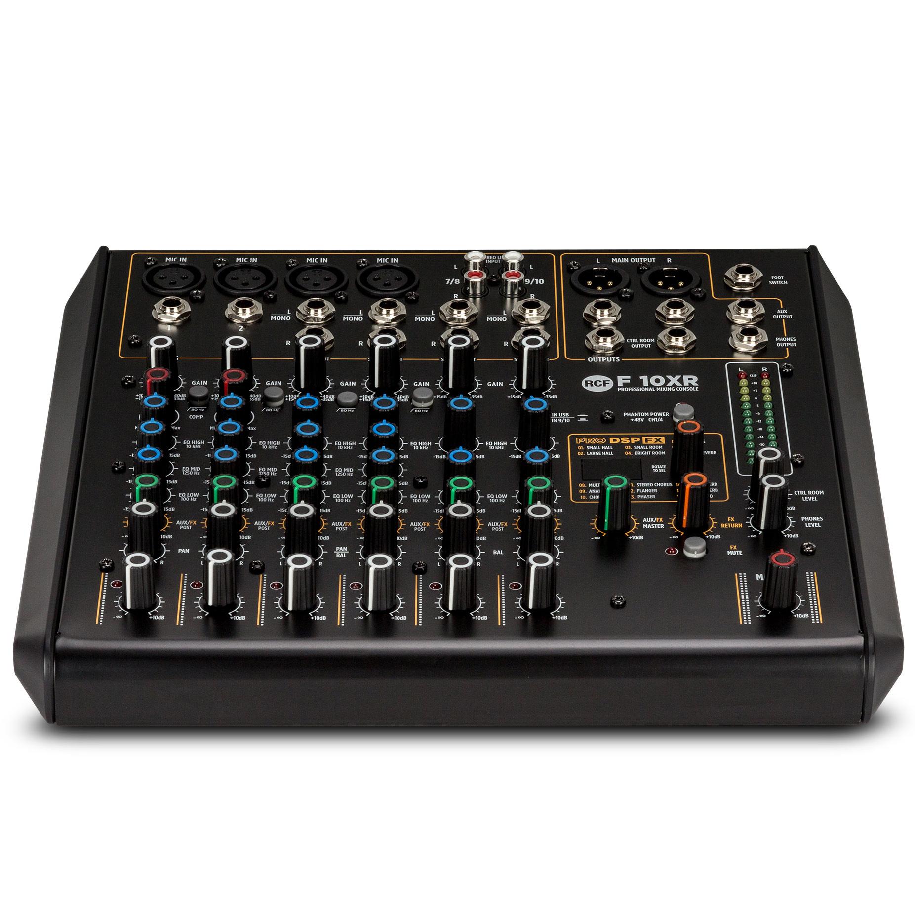 The RCF F 10XR analog mixer provides high quality sound with an aesthetically pleasing interface, 16 pro DSP effects, rugged metal chassis and connectors. The F10XR is the 10 channel version in this fantastic range of next generation mixers from RCF.